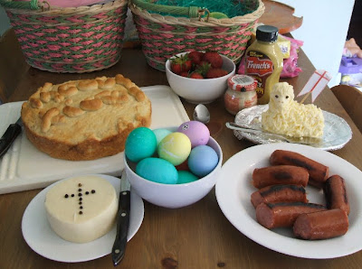 Basically, the foods traditionally included in the Easter meal were those that were originally given up during Lent, including all meat and dairy products. Those foods certainly tasted good if you had given them up for 40 days! A great explanation of the meanings of the religious meanings of the different foods can be found here. Here’s what we usually include in our Easter basket: