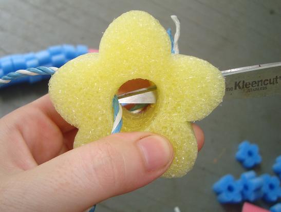 For the rosary center, you can use a slice of a 3rd color of a pool noodle, or an extra Our Father bead. Poke holes in both sides with scissors, and bring your clothesline through.