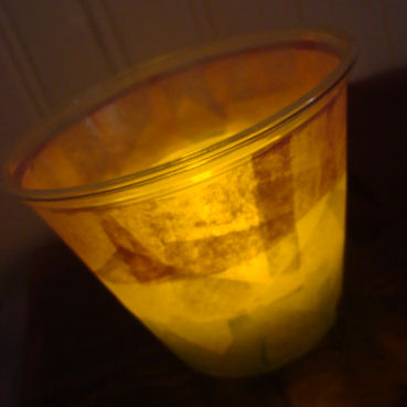 When the glue is dry, put the candle inside and let your light shine! The effect of the candle behind the tissue paper will be similar to stained glass. Here’s how it will look in the dark: