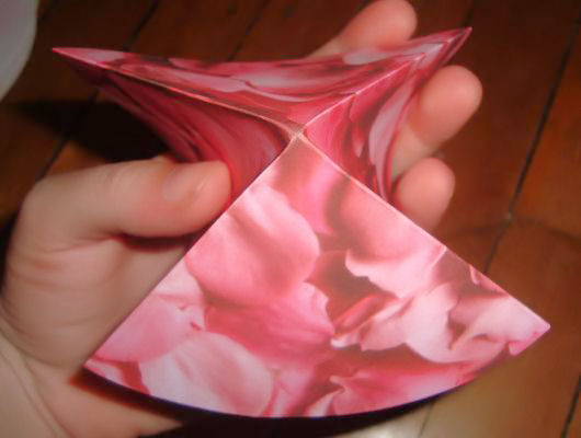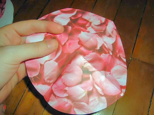 Start with some 10×10 scrapbooking paper (something with roses on it) and fold it in fourths. Then trace a circle on it using a bowl, and cut them out.